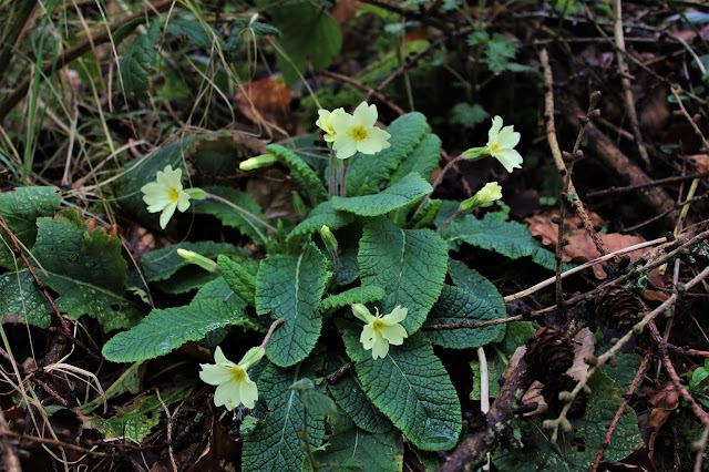 The Primulas were undoubtedly the stars of the day. They belong to the family Primulaceae, and there are, with the natural hybrids, some 4 or 5 native species in Ireland. At this stage P. vulgaris - aka P. acaulis - was the only one I found, also the only species present in Portuguese flora. The scientific name of this plant derives (obviously from Latin) and means one of the first flowers to appear in spring, and 'vulgaris' means that it is common. It is native to the western and southern parts of Europe, and is also present in northwestern Africa and southwest Asia.